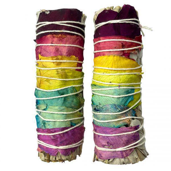 Natural rose petals are placed on the sage bundle, petals may have variation in color and browning as the drying process occurs.